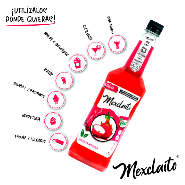 Mexclaito Xero 0% Azúcar sabor Dragon Fruit es nuestra propuesta más innovadora en Jarabes. Sueña con un mundo lleno de dulzor y sabor inigualables, con Stevia Endulzante.